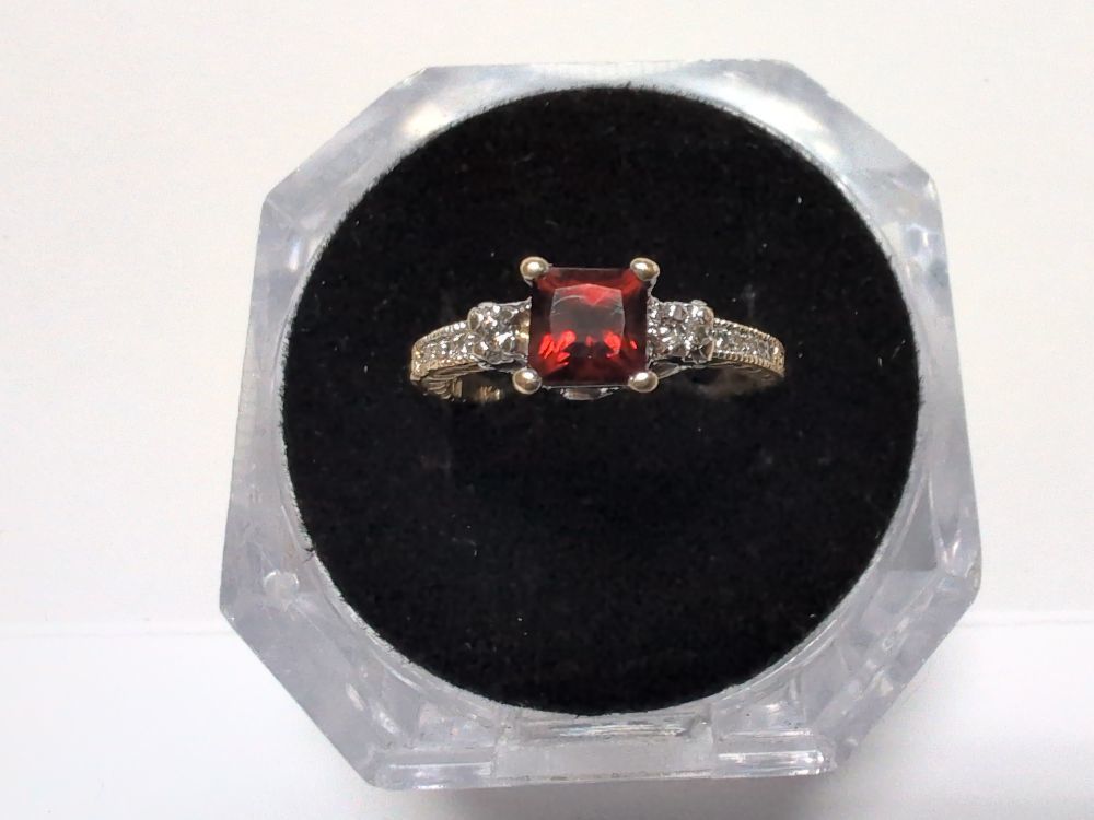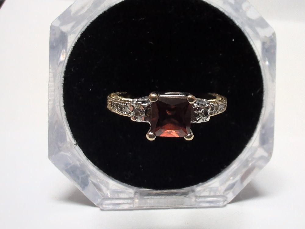 Ring with a princess cut garnet, 10 0.5pnt and 2 1pnt diamonds (0.07TCW) Two tone Gold Ring Sz:8.5 3.28g/14kt