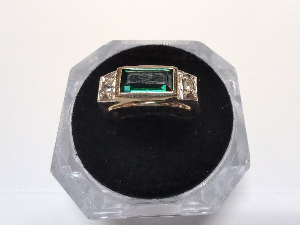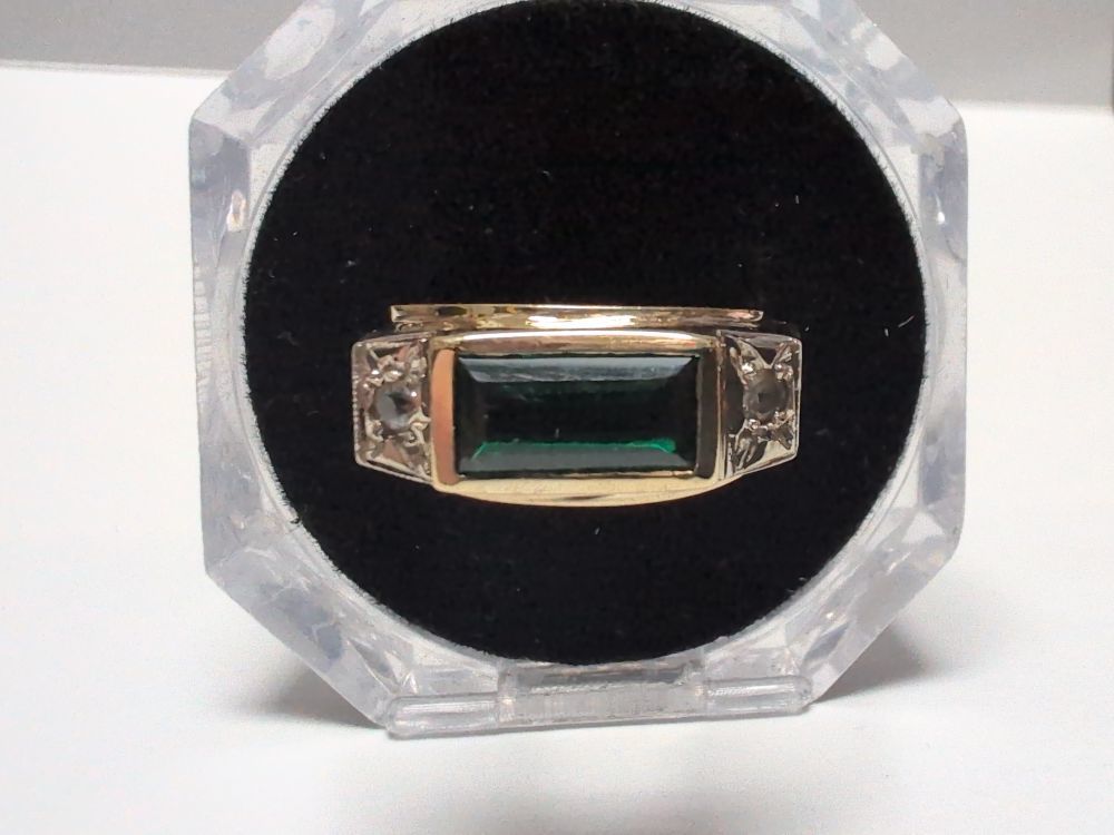 Gold 10kt Yellow 5.14gms Ring Sz:12 with a green stone and 2 clear stones Yellow Gold Ring Sz:12 5.14g/10kt